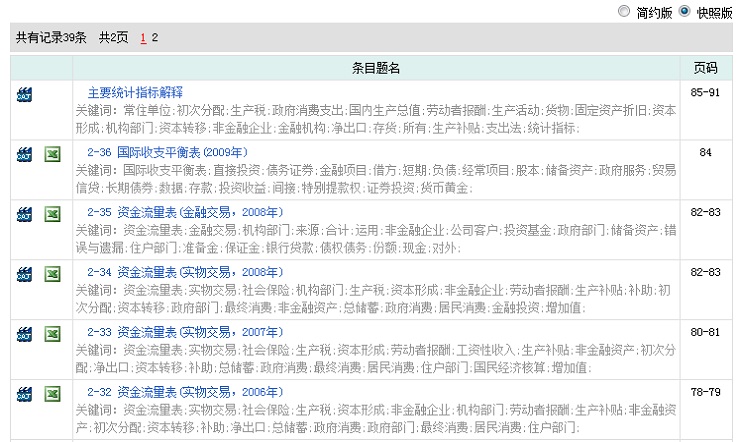 结果显示区为该章节下的所有条目信息(网站默认风格为简约版),包括了国民经济核算章节内的子条目及其在该书中的具体页码,并提供CAJ和EXCEL两种下载方式。用户可点击条目名称,打开查看条目知网节信息。如:点击选择“2-2国内生产总值构成”,则进入该条目的知网节页面进行查看。 网站提供了快照风格的页面浏览功能,添加每个条目的正文快照,帮助用户直观快速了解该条目是否涵盖所需的指标。