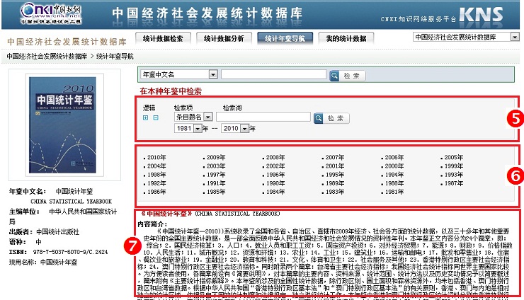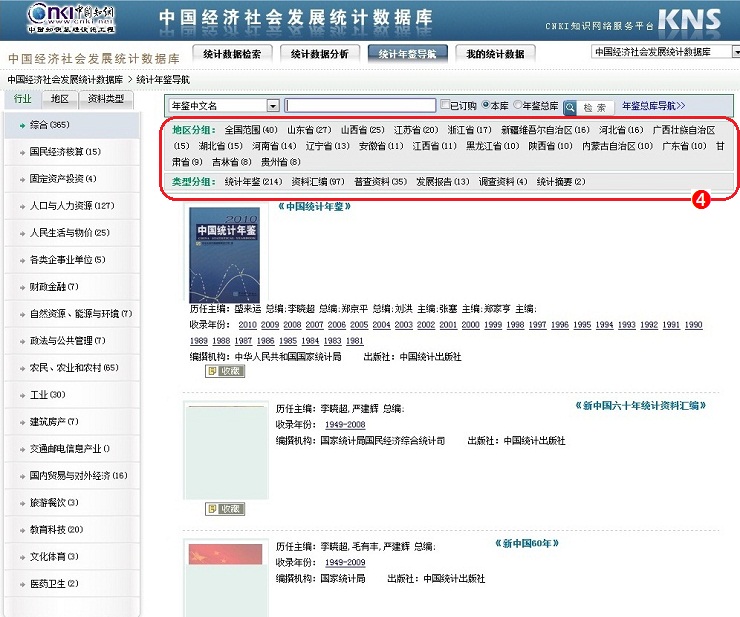 图中的④为结果聚类条件区,通过在该区进行选择,可以进一步对当前的检索结果进行地区或资料类型分类。比如,点击地区全国范围选项时,结果将自动筛选为行业为综合、覆盖范围为全国的统计年鉴资料(注:结果导航聚类条件只能任选一种,本例中只能选择按地区或按资料类别中的一种对初次检索结果进行进一步筛选。二者不可同步、不可叠加)。在结果显示区域内,用户可以选择年鉴进行查看。具体查看方式有两种,一种是直接点击想要查看年鉴名称,进入单种年鉴页面,该页面显示了此种年鉴的所有年份分册,用户可以通过点选相应的年鉴年份来打开该年的统计年鉴资料进行查看。