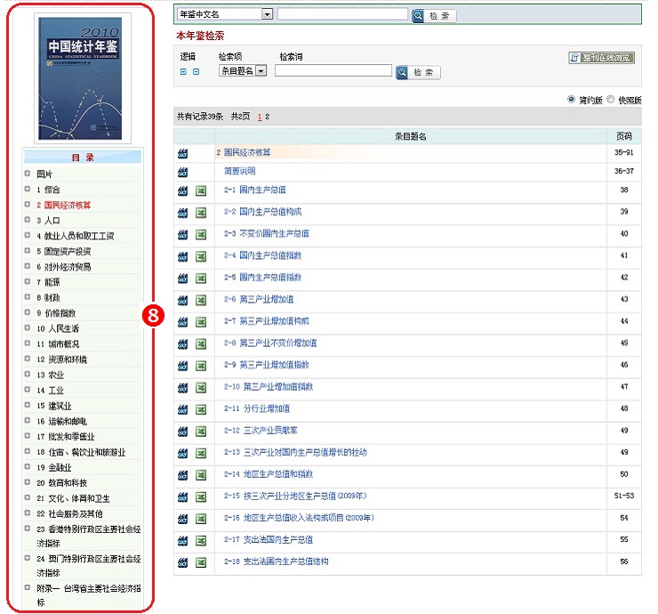⑤是该种年鉴的条目检索控制栏,包含检索关键词和年份检索控制两个条件,检索项有条目名称和正文两种。检索范围包括该种年鉴的所有年份刊。 ⑥是年鉴年份,用户可以通过点击相应的年份直接查看当年的统计年鉴。 ⑦是此种年鉴的简要介绍。内容包括:年鉴类别、刊数、章节概述、统计口径、数据来源、历史沿革和符号说明等重要信息,可以帮助用户快速掌握该种年鉴所涉及的数据资料领域,提高查阅搜索速度。 以中国统计年鉴2010为例,页面进入单本年鉴页面, 其中⑧为该本年鉴的封面快照和章节目录导航链接,用户可以通过点击此处,打开相应的章节,此处选择“国民经济核算”,显示页面如下: