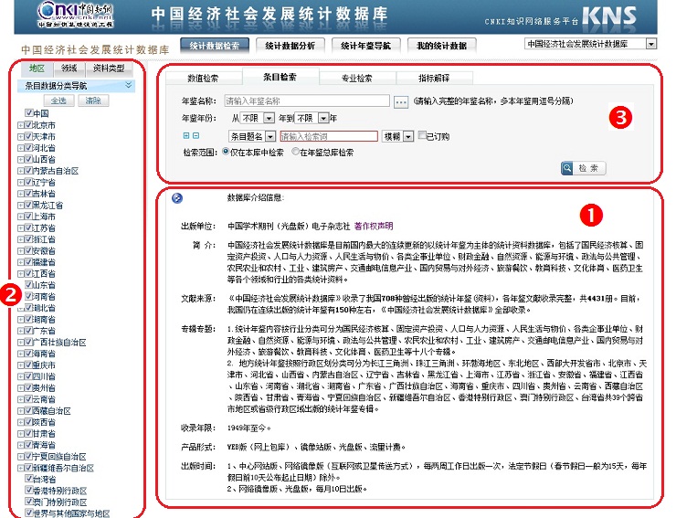 统计数据检索平台该平台旨在帮助用户快速高效的查找到所需的指标,检索功能上分为数值检索、条目检索、专业检索和指标解释四类。通过点击中国经济社会发展统计数据库中统计数据检索图标,进入统计数据检索平台,主界面(网站默认标准检索页面作为主界面)。 ①是检索结果显示区,当未进行任何检索时,网站默认显示数据库资源简介。数据库介绍信息包括了出版单位、简介、文献来源、专辑专题、收录年限、产品形式及出版时间等相关信息。 ②为分类导航,该导航同样有三种导航方式:地区、领域、资料类型。但不同于统计年鉴检索平台里导航,这里的导航只对条目检索结果起聚类效果。 ③为检索条件自定义区,此平台中各种数据检索方式均将检索条件自定义内容放置于此。检索项有正文和条目名称两种,检索方式有精确和模糊两种,用户可对其自行选择。