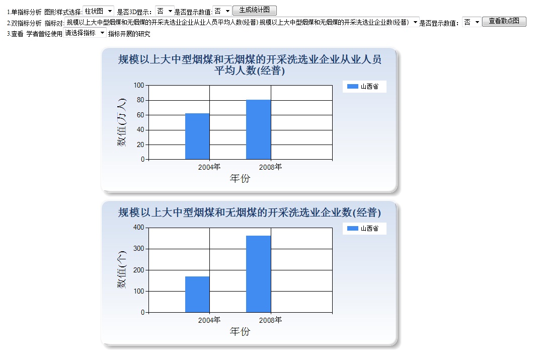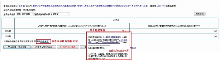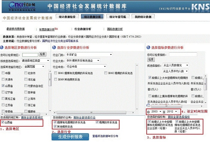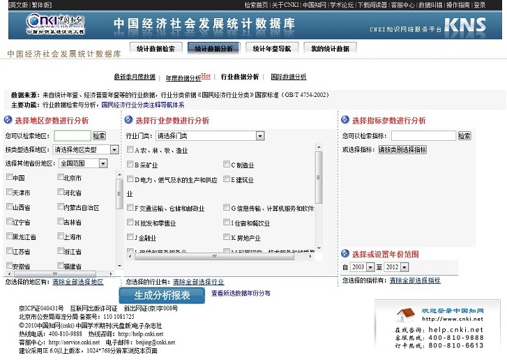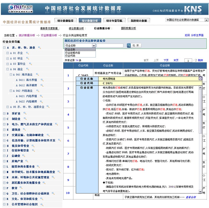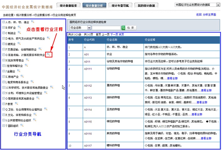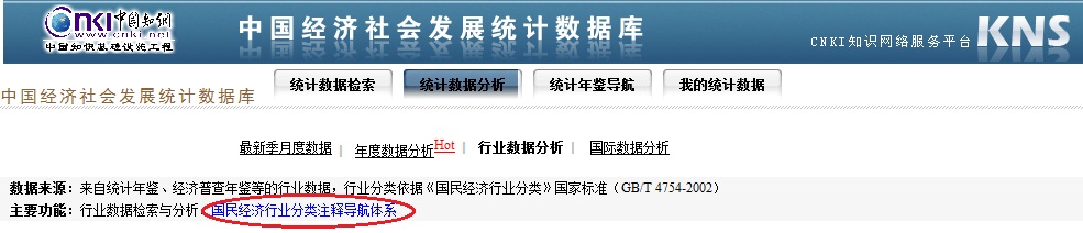 行业数据分析使用指南行业数据分析中的数据严格按照国家统计局2002年出版的《国民经济行业分类》(GB/T 4754-2002)进行行业数据划分,提供数据检索浏览、国民经济行业分类详细注释等服务,旨在打造一个查询行业发展数据,洞悉行业发展态势的数据挖掘检索平台。用户可通过设定地区、行业、指标、年份范围四类参数进行相关行业的数据检索,并查看相应的数据分析报表。 图1 行业数据分析主界面 ◎ 行业分类注释导航为了便于用户准确查找所需行业数据,系统将国家统计出版社2008年出版的《国民经济行业分类注释》制作电子导航查询体系,用户可点击“行业数据分析”主界面上方的国民经济行业分类导航体系进行行业归属查询,如图2所示。 图2 国民经济行业分类注释检索体系入口 如图3所示,界面左侧为国民经济行业分类导航,点击行业分类字符或者行业分类前的 ![]() 图3 国民经济行业分类注释检索体系 点击每条注释的查看全部,系统自动弹出该分类的注释框,如图4所示: ![]() 图4 国民经济行业分类注释详情界面 ◎ 使用范例--山西省烟煤和无烟煤企业数量和从业人数变化情况在“行业数据分析”主界面,设置地区参数、行业参数、指标参数、时间范围。根据示例要求,地区选择“山西省”;行业门类选择“采矿业”,行业大类选择“煤炭开采和洗选业”,行业中类选择“烟煤和无烟煤的开采洗选”;指标选择“规模以上大中型烟煤和无烟煤的开采洗选业企业数(经普)”、“规模以上大中型烟煤和无烟煤的开采洗选业企业从业人员平均人数(经普)”。年份范围设置为2003-2010年。如图5所示。 ![]() 图5 行业数据参数设置 选定地区、行业、指标、时间范围后,点击“生成分析报表”,得到统计数据报表,如图6所示。 图6 2004和2008年山西省烟煤和无烟煤企业数量和从业人数变化情况 统计数据报表中的每个数字均有其可靠的来源和权威的出处。将光标放在具体数字上时,该数字的来源信息即现。此外还可以通过下载查看Excel格式的原版统计报表来核实和考证图表中的数据,或点击表格下方的数据来源,直接查看整个报表的数据来源信息。 除了生成统计数据报表之外,平台还可以自动生成各类统计图。 “一图胜千言”,利用统计数据的制作成的折线图、柱状图等可以帮助您进行统计指标的发展走势分析、时间序列分析、地区对比分析、指标对比分析等等。如图7所示。 图7 统计数据报表的图形辅助分析功能 |